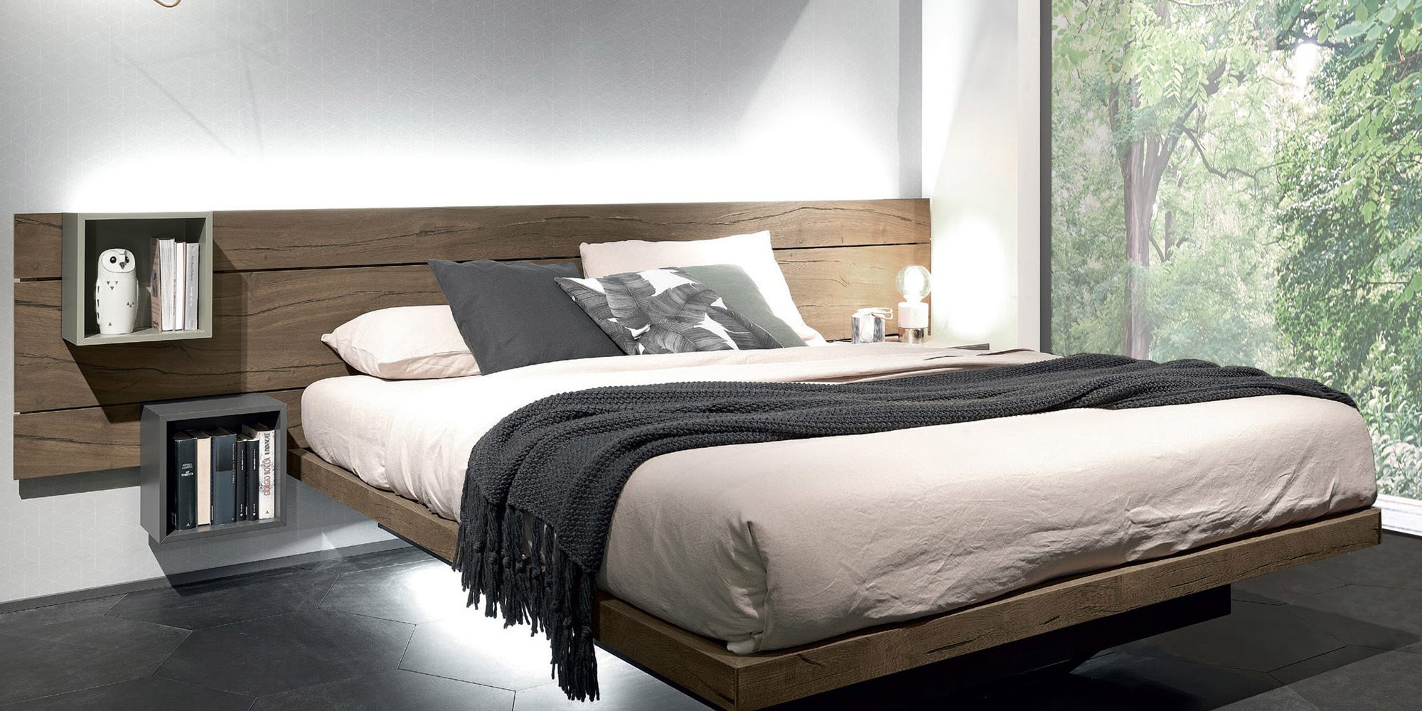Nello specifico il letto SORVOLO caratterizzato dalla testata boiserie a muro realizzata a misura, vi permette di arredare il cuore della camera da letto dando un senso di leggerezza e sospensione